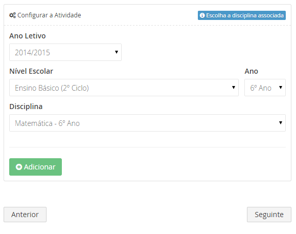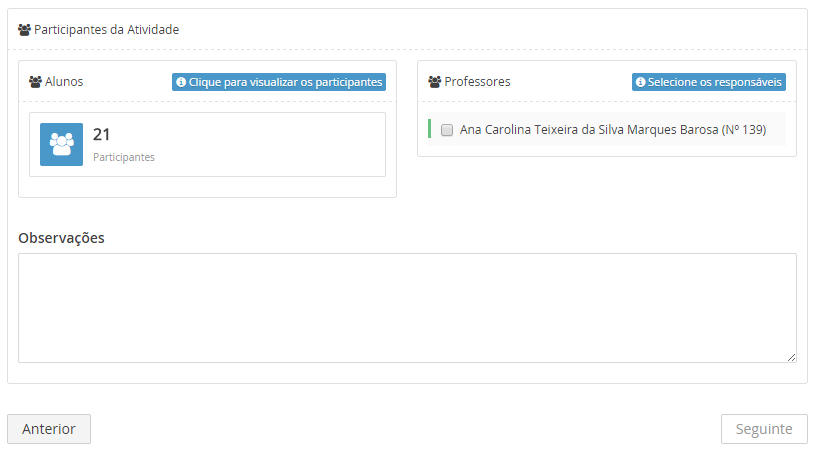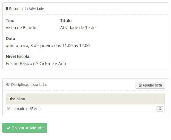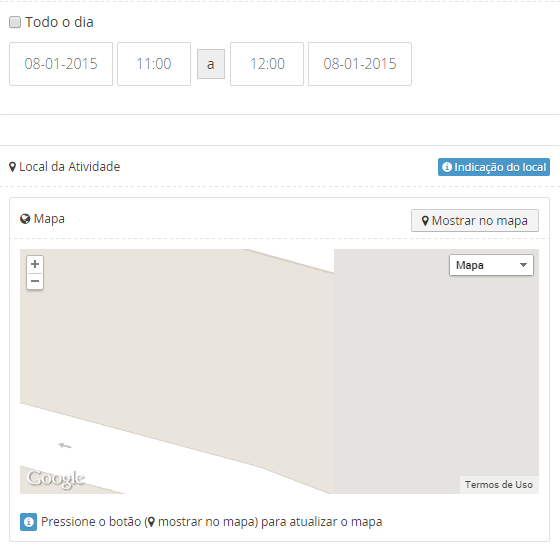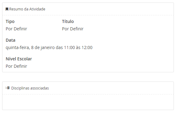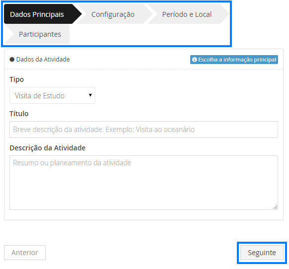 Nesta área de criação de uma nova atividade, terá de preencher os dados que estão organizados em quatro secções: Dados Principais, Configuração, Período e Local de Participantes.