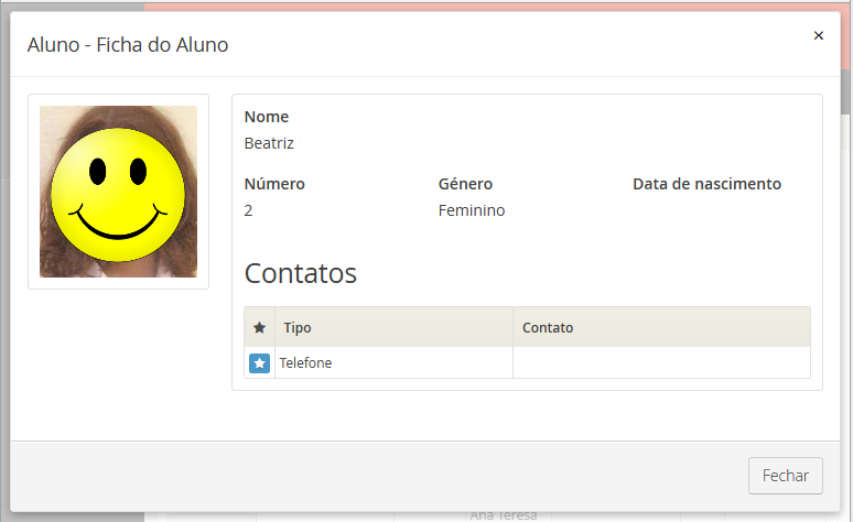 Visualizando o ponto anterior (segunda imagem ilustrada com a lista de alunos), existe um botão de detalhes para cada aluno (símbolo de informação) no fim da linha para cada aluno. Clicando nesse botão, vai abrir uma janela (pop up) conforme a figura ao lado, onde poderá consultar as informações relevantes para o aluno.