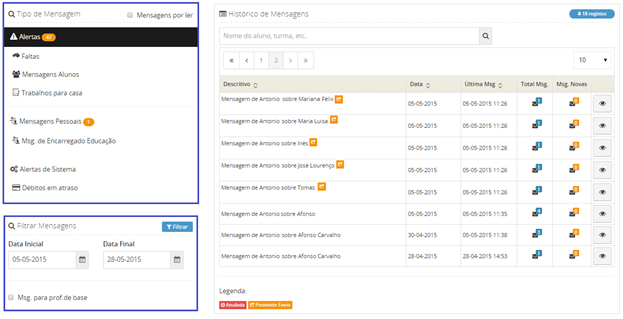 Esta área de gestão de detalhes está subdividida em cinco partes: Conversação, Referente, Participantes, Nova Mensagem e Adicionar Professores à Conversa
