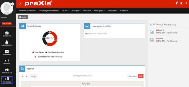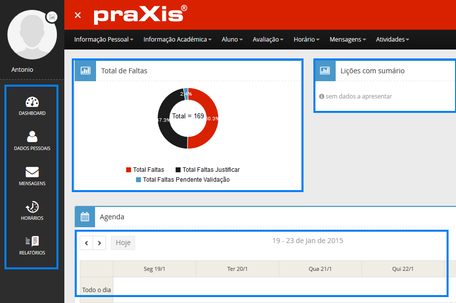 No fim da página poderá consultar a sua agenda para os dias atuais. Como predefinição, a agenda está configurada para mostrar atividades do dia atual. Pode sempre alterar a apresentação para visualização semanal ou mensal.