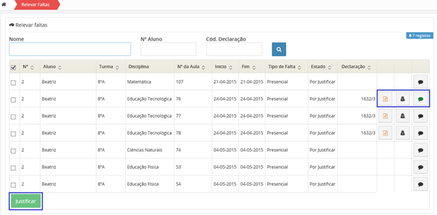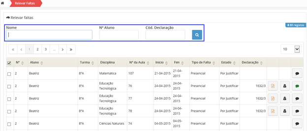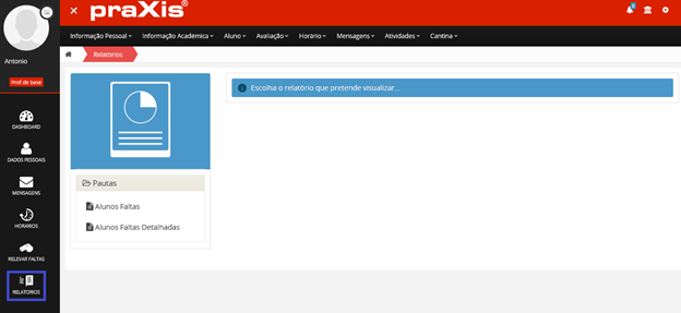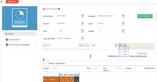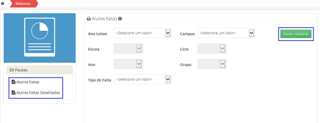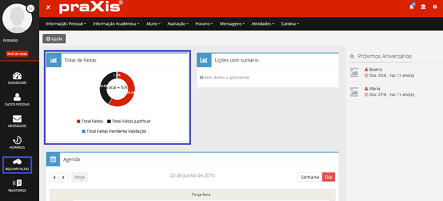 Poderá visualizar, os dados de faltas referentes ao universo total de faltas existentes, no retângulo com gráfico circular.