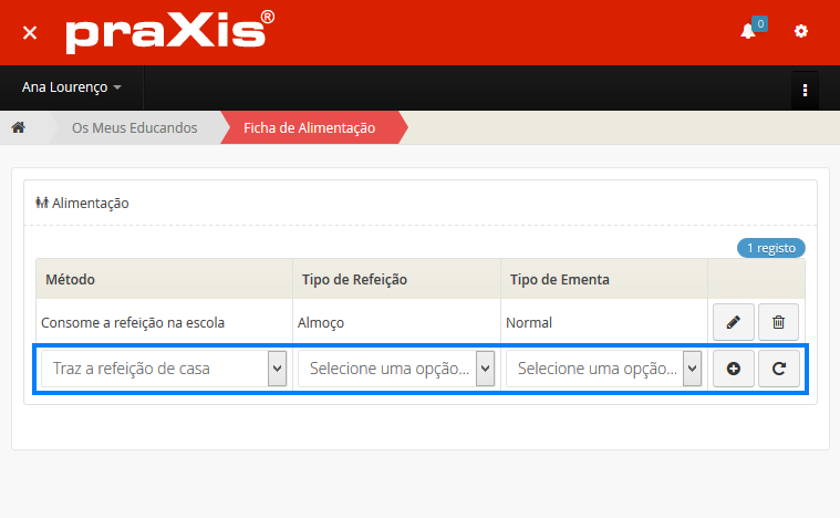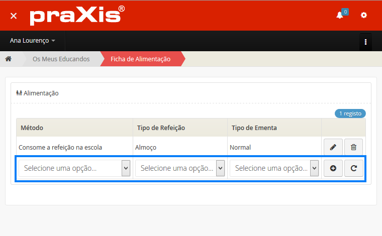 Ao aceder a esta Área de Gestão, poderá gerir as fichas de alimentação referentes aos seus educandos.