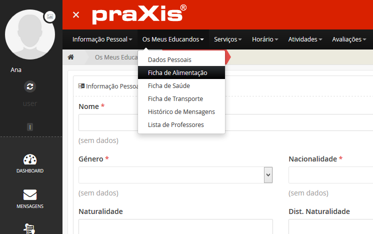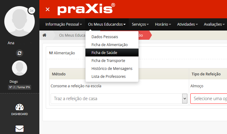 Ao fazer login na aplicação, navegue até à opção de Menu OS MEUS EDUCANDOS > FICHA DE ALIMENTAÇÃO.