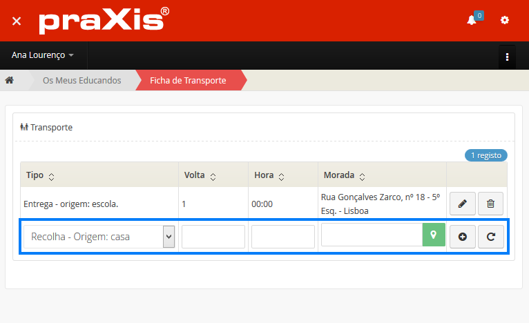 Ao aceder a esta Área de Gestão, poderá gerir as fichas de transporte referentes aos seus educandos.