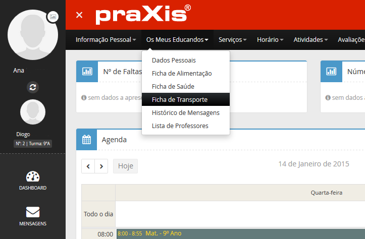 Para validar se já tem selecionado um dos seus educandos, verifique na barra lateral situada no canto superior direito. Se aparece um dos seus educandos é porque é este que está selecionado. Se não aparecer nenhum dos seus educandos, é porque não tem selecionado nenhum.