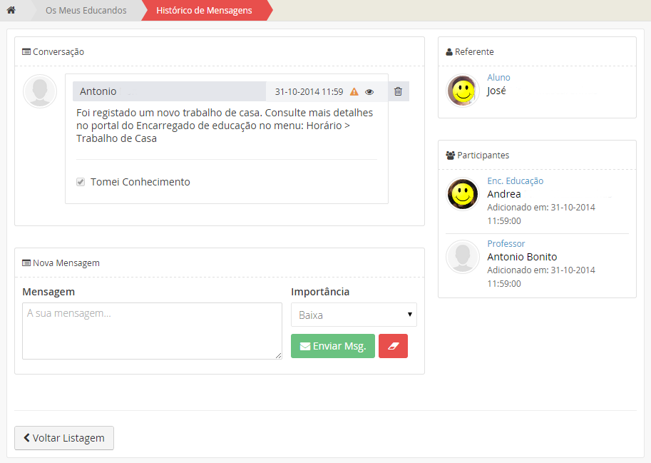 Permite inserir / editar a informação relacionada com o histórico de mensagens. Nesta opção poderá definir informação como, por exemplo, os detalhes informativos de uma mensagem de alertas para o educando, mensagens pessoais, trabalhos para casa, mensagens de encarregados de educação, entre outras opções.