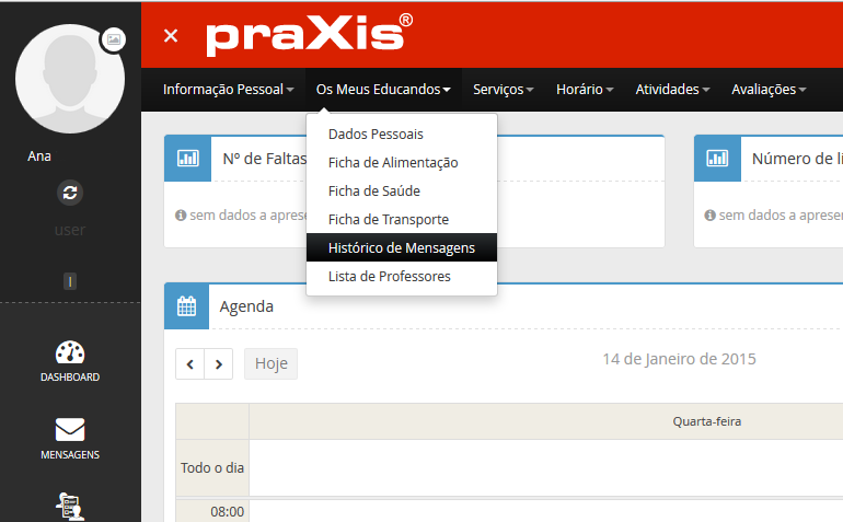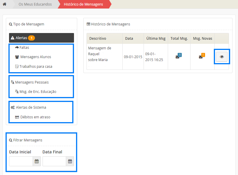 Ao fazer login na aplicação, navegue até à opção de Menu OS MEUS EDUCANDOS > HISTÓRICO DE MENSAGENS.