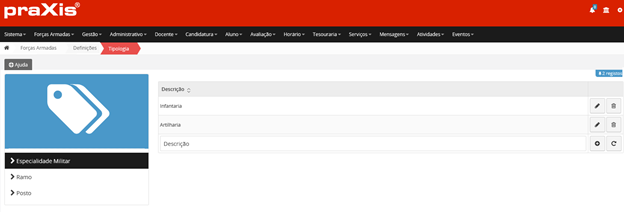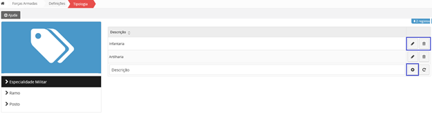 Para editar ou alterar uma Especialidade Militar, um Ramo ou um Posto, deverá clicar no botão editar