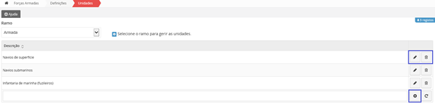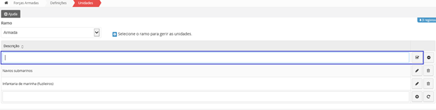 Quando edita ou insere uma Especialidade Militar, um Ramo ou um Posto, vai-lhe aparecer um símbolo no extremo de cada item. Para guardar as alterações, deverá clicar nesse botão.