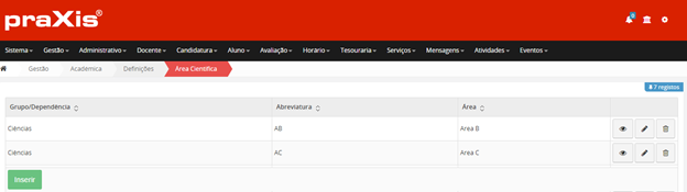 A inserção de novos registos será realizada diretamente na tabela, terminando o processo premindo o botão de adição