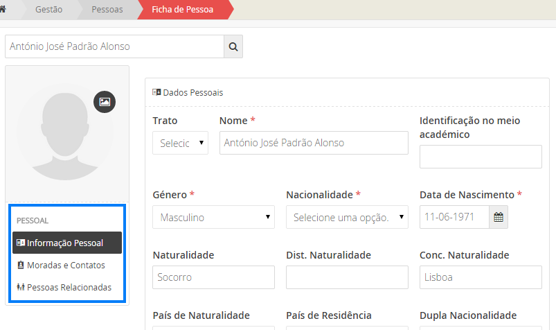 Os dados de edição de uma ficha de pessoa estão organizados em várias subsecções (conforme a imagem a cima): informação pessoa, morada e contatos e pessoas relacionadas, para consulta ou edição de dados.