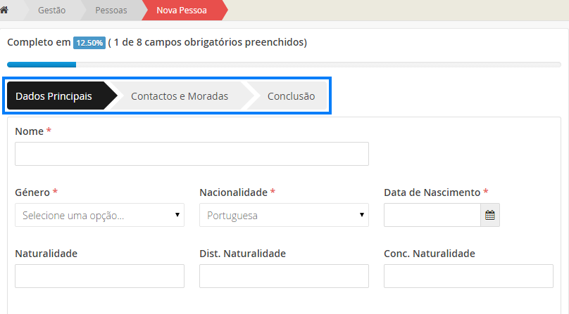 O preenchimentos dos dados da nova pessoa está repartido em três secções: dados principais, contatos e moradas e conclusão.