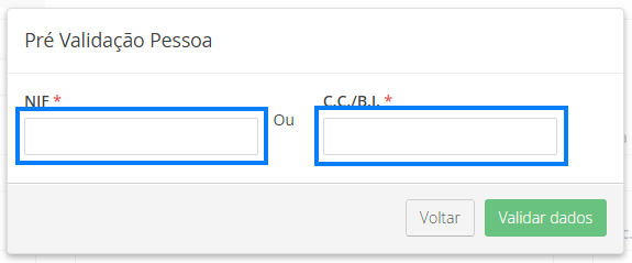 Ao aceder à secção de introdução de uma nova pessoa, ser-lhe-á apresentado uma janela (pop up) para efetuar uma pré-validação dos dados.