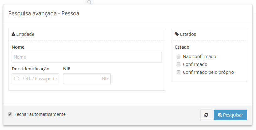 Ao aceder à secção de consulta e gestão de pessoas, ser-lhe-á apresentado uma janela (pop up) que vai permitir efetuar uma filtragem inicial dos dados de uma pessoa.