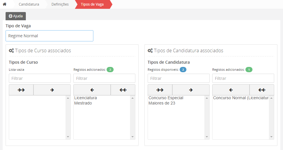 Aceda a página de gestão de tipo de vagas para verificar Associar os tipos de cursos aos tipos de Candidaturas, ou seja os tipos de vaga servem para definir a associação entre um tipo de curso (ex: Licenciatura) a um tipo de candidatura (ex: Concurso Normal)